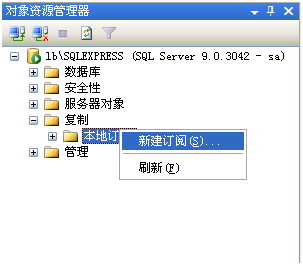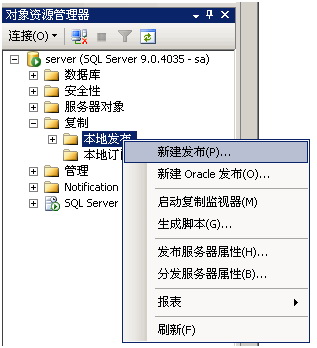 (1)首先我們在發布服務器上(winserver2003)打開SqlServer2005 Management Studio (企業版)。在“對象資源管理器”中找到復制節點,右鍵--->新建發布(注:如果你的SqlServer是express版本的話,是沒有發布這一功能的,只有訂閱功能!)