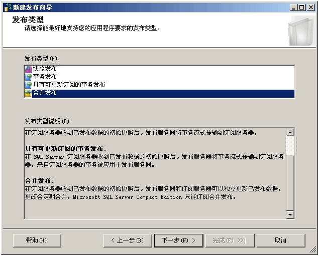(2)接下來選擇要發布的數據庫,下一步,選擇“發布類型”,我這里選擇“合并發布”