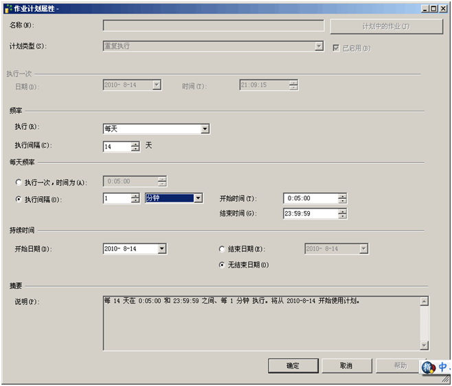 (5)接下來設置作業計劃,為了方便看到測試效果,我們設置“每隔一分鐘”執行一次作業。
