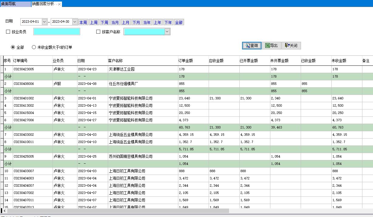 銷售回款分析表是統計一段時間內銷售訂單的執行情況,包括訂單金額、已開票金額、未開票金額、已收款金額、未收款金額。可以幫助營銷人員、財務人員實時了解訂單的應收款情況的統計報表。