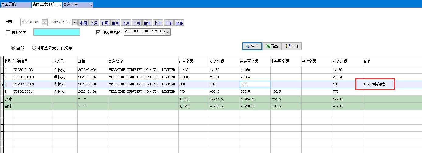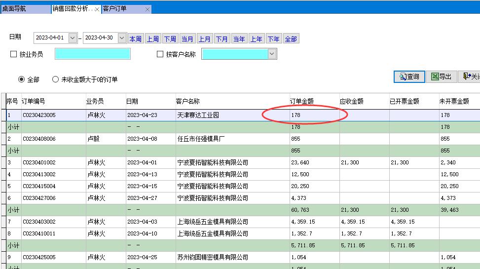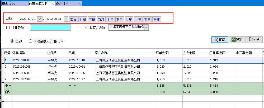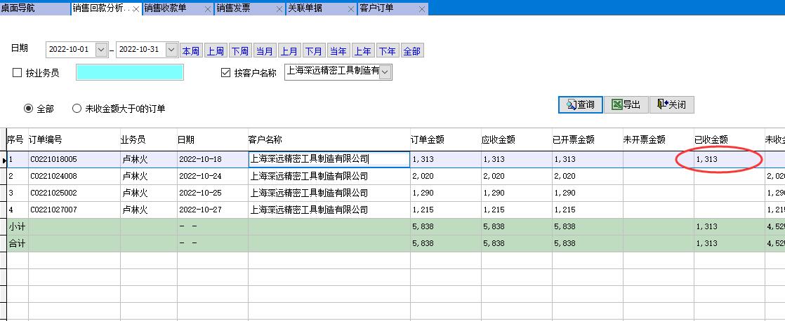 已收款金額 即銷售收款單金額 按日期查詢 這里的日期是指客戶訂單上的單據日期 單據日期和制單日期是有區別的,比如訂單實際發生日期是1月1號,而我們是在1月2號將該訂單錄入到ERP系統中,那么單據日期要修改為1月1號,制單日期是1月2號。 備注 備注是客戶訂單上的備注 折扣 假設訂單金額1萬,發貨金額也是1萬,客戶要求10%的折扣,即開票金額還是1萬,但是收款金額是0.9萬 最終在銷售回款分析表中的結果 導出 導出格式在導出布局中可以設置 權限 設想以下幾種場景: 1、我們需要業務員只能看到自己客戶的訂單,不能看其他業務員的訂單 在業務員設置中可以設置是否只能看自己的訂單,或自己的訂單和公共客戶的訂單(即沒有指定業務員的訂單),設置后在銷售回款分析表中該業務員只能看到自己訂單的數據 2、有兩個銷售部門,業務員可以看到本部門內所有業務員的數據,但是不能看到其他部門的訂單數據。 做如下設置后,在銷售回款分析表中就只能看到本部門的訂單數據。