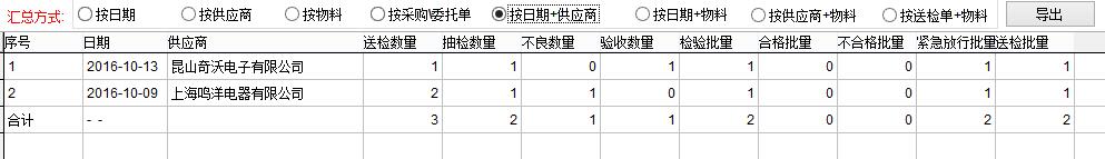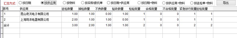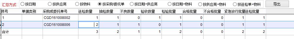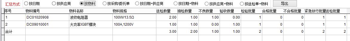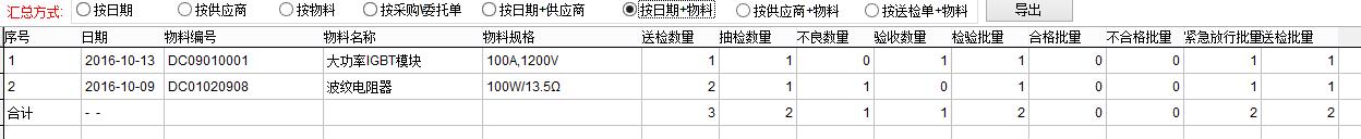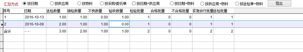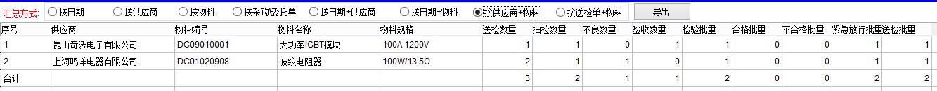 匯總方式 按日期匯總 按供應商匯總 按物料匯總 按采購單匯總 按日期+供應商匯總 按日期+物料匯總 按供應商+物料匯總 按送檢單+物料匯總 導出 可以將上面的明細導出到excel 也可以將下面的匯總導出到excel