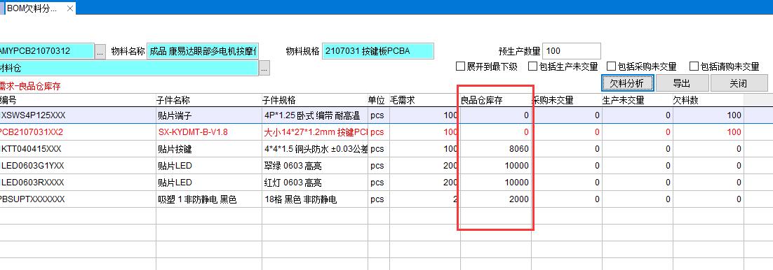 BOM欠料分析與MRP計算都是對物料需求進行分析,與MRP計算不同的是BOM欠料分析功能簡單計算速度快,只對現有庫存進行欠料分析。