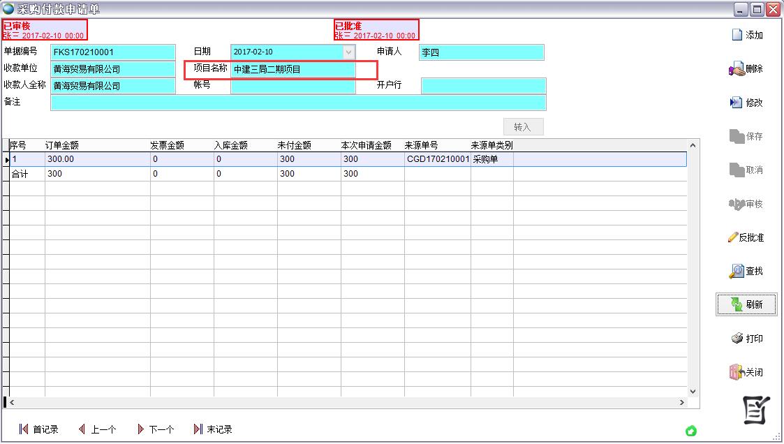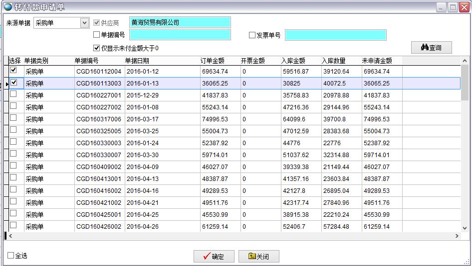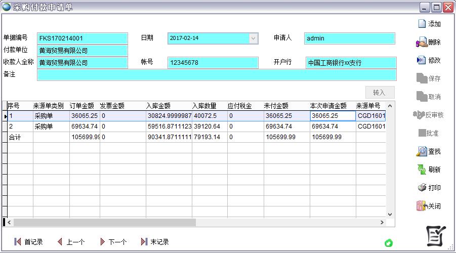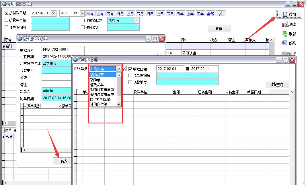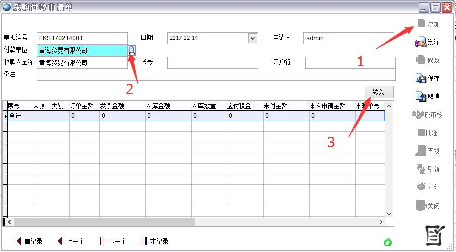 點轉入后在轉付款申請單中選擇來源單據、和符合條件的記錄點保存。