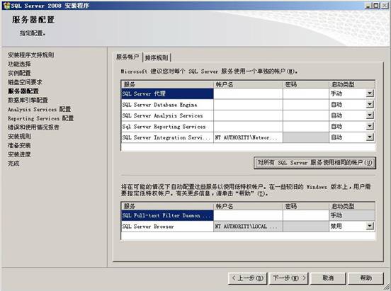 27.服務器配置主要是服務啟動帳戶的配置,服務的帳戶名推薦使用SYSTEM的系統(tǒng)帳戶,并指定當前選擇服務的啟動類型,點擊“對所有SQL Server服務使用相同的帳戶”,如下圖所示: