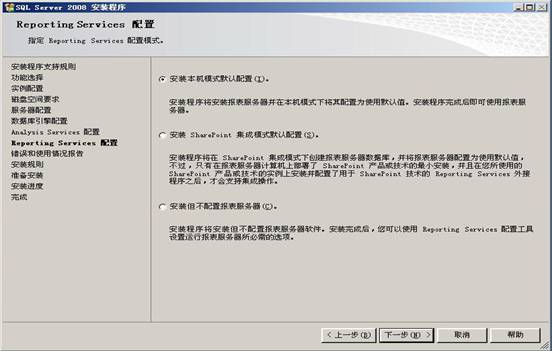 38.Analysis Services(分析服務(wù))主要是為商業(yè)智能解決方案提供聯(lián)機(jī)分析處理 (OLAP) 和數(shù)據(jù)挖掘功能。點擊【添加當(dāng)前用戶】按鈕, SYSTEM的系統(tǒng)帳戶(Administrator)即可添加到相應(yīng)的表框內(nèi),然后點擊【下一步】,出現(xiàn)Reporting Services(報表服務(wù))的界面,如下圖所示:
