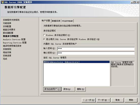 36.在帳戶設(shè)置里面,選擇“混合模式”的身份驗證模式,輸入SQL Server系統(tǒng)管理員帳戶的密碼,點擊【添加當(dāng)前用戶】按鈕,然后對數(shù)據(jù)安裝目錄進(jìn)行設(shè)置,點擊【數(shù)據(jù)目錄】,如下圖所示: