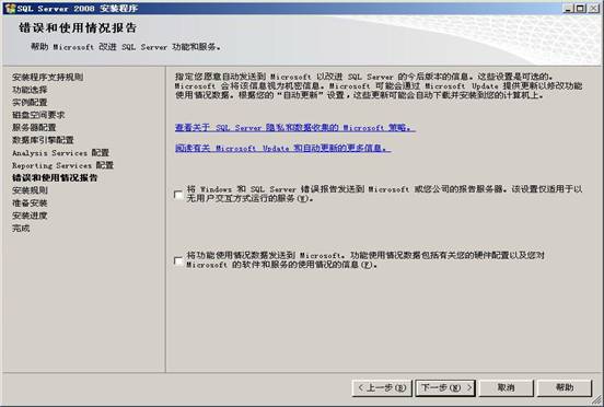 39.Reporting Services (報表服務(wù))包含用于創(chuàng)建和發(fā)布報表及報表模型的圖形工具和向?qū)В挥糜诠芾?/SPAN> Reporting Services 的報表服務(wù)器管理工具;以及用于對 Reporting Services 對象模型進(jìn)行編程和擴(kuò)展的應(yīng)用程序編程接口。選擇“安裝本機(jī)模式默認(rèn)配置”,點擊【下一步】,出現(xiàn)錯誤和使用情況報告的界面,如下圖所示: