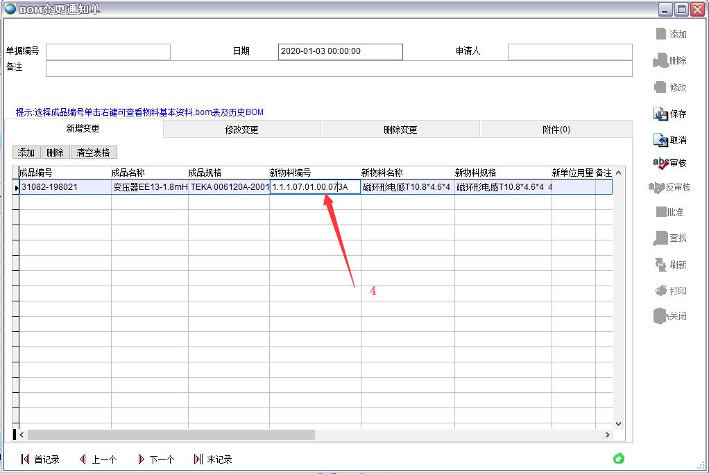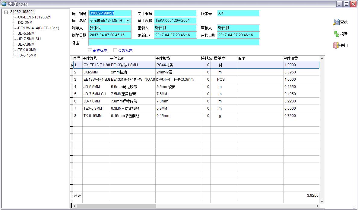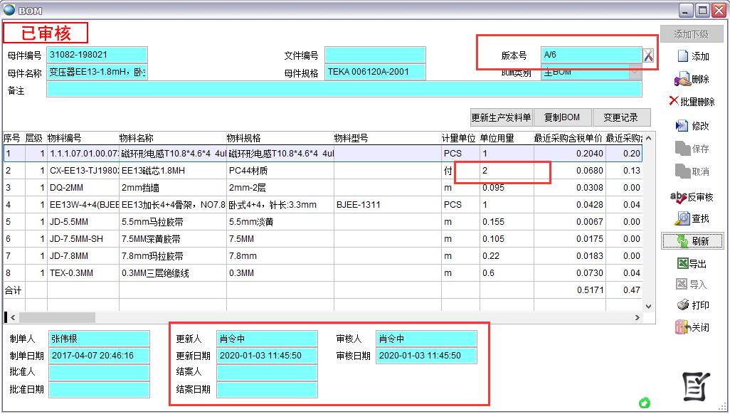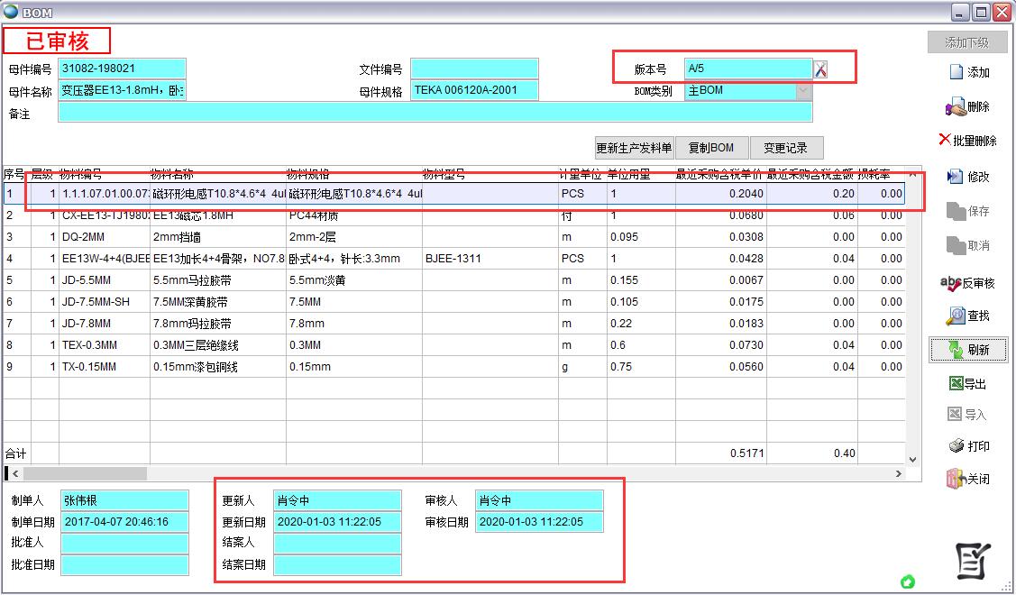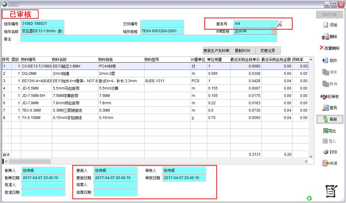 3、如果BOM為審核狀態則審核人、審核日期發生變化
