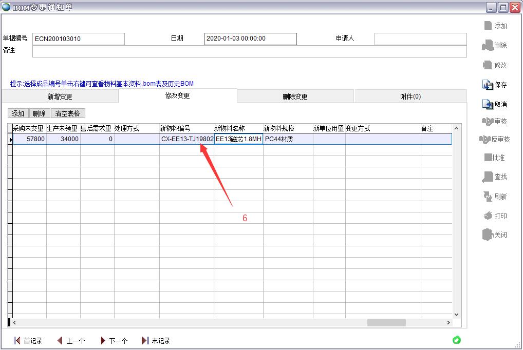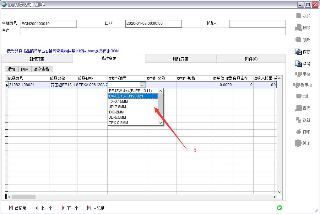 5、從列表中選擇要變更的物料