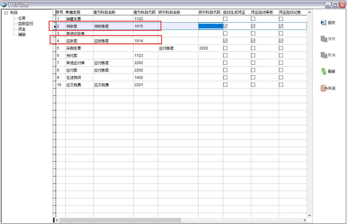1、在科目設置中設置預收款、應收款的借方科目,并勾選自動生成憑證
