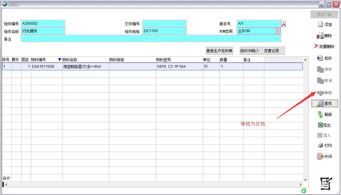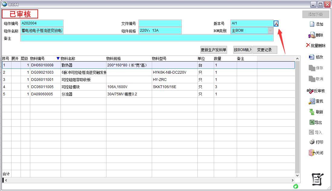 當審核過的BOM點反審核后,版本號會自動加1。BOM在未審核的狀態下進行修改,版本號不會發生變化。