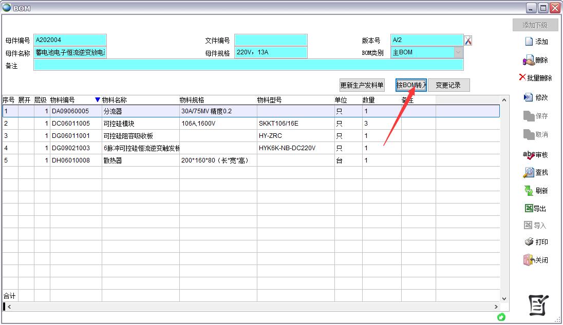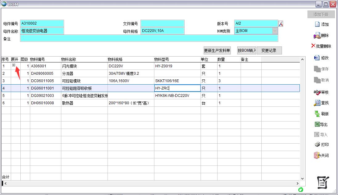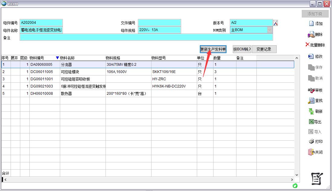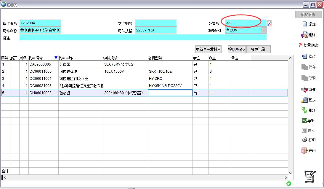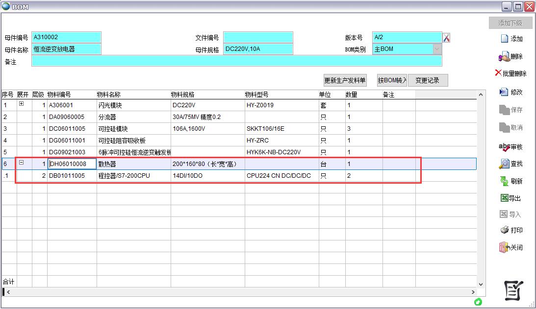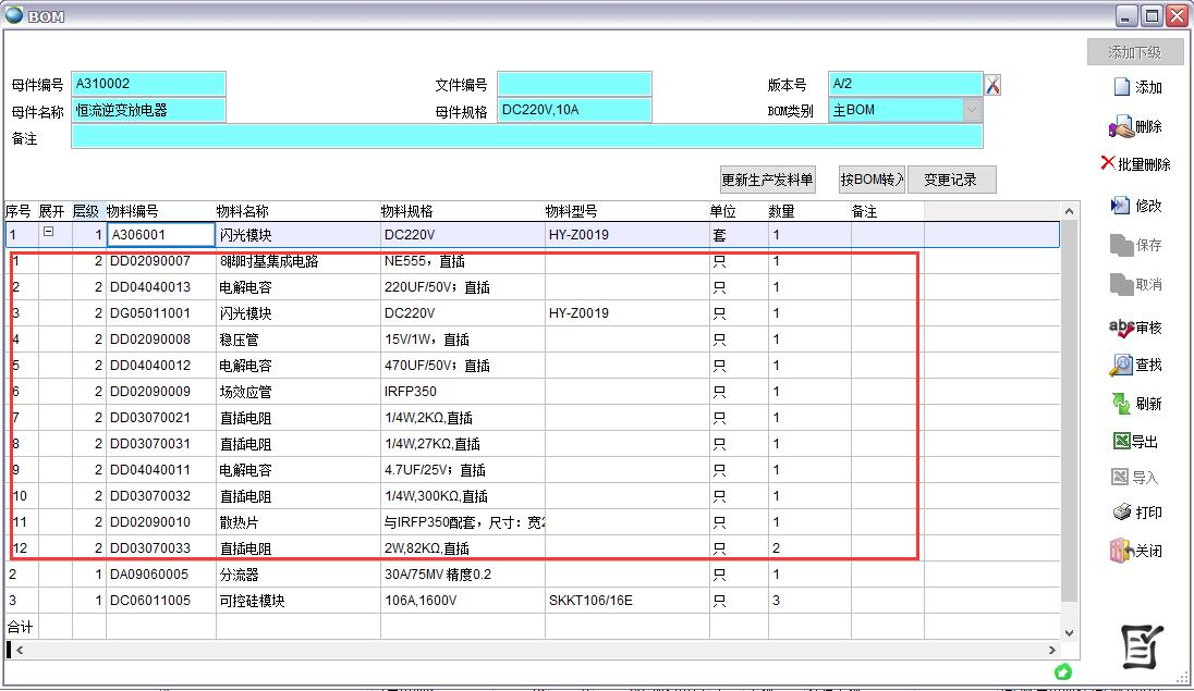 母件編號是指組成這個BOM的產成品,以上圖為例就是蓄電池電子恒流逆變放電裝置。