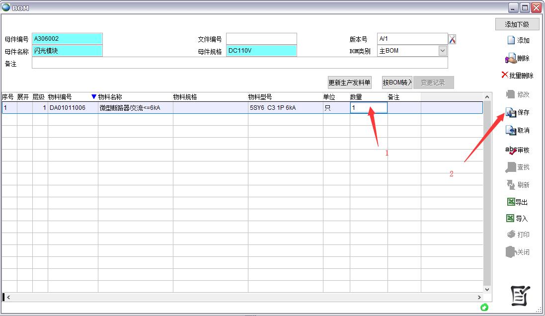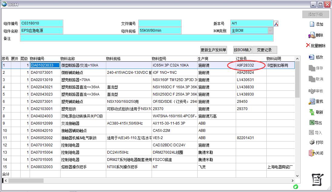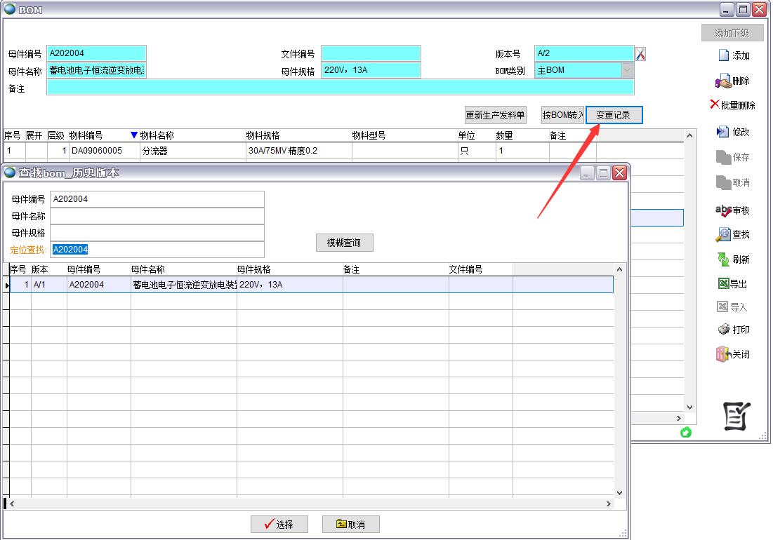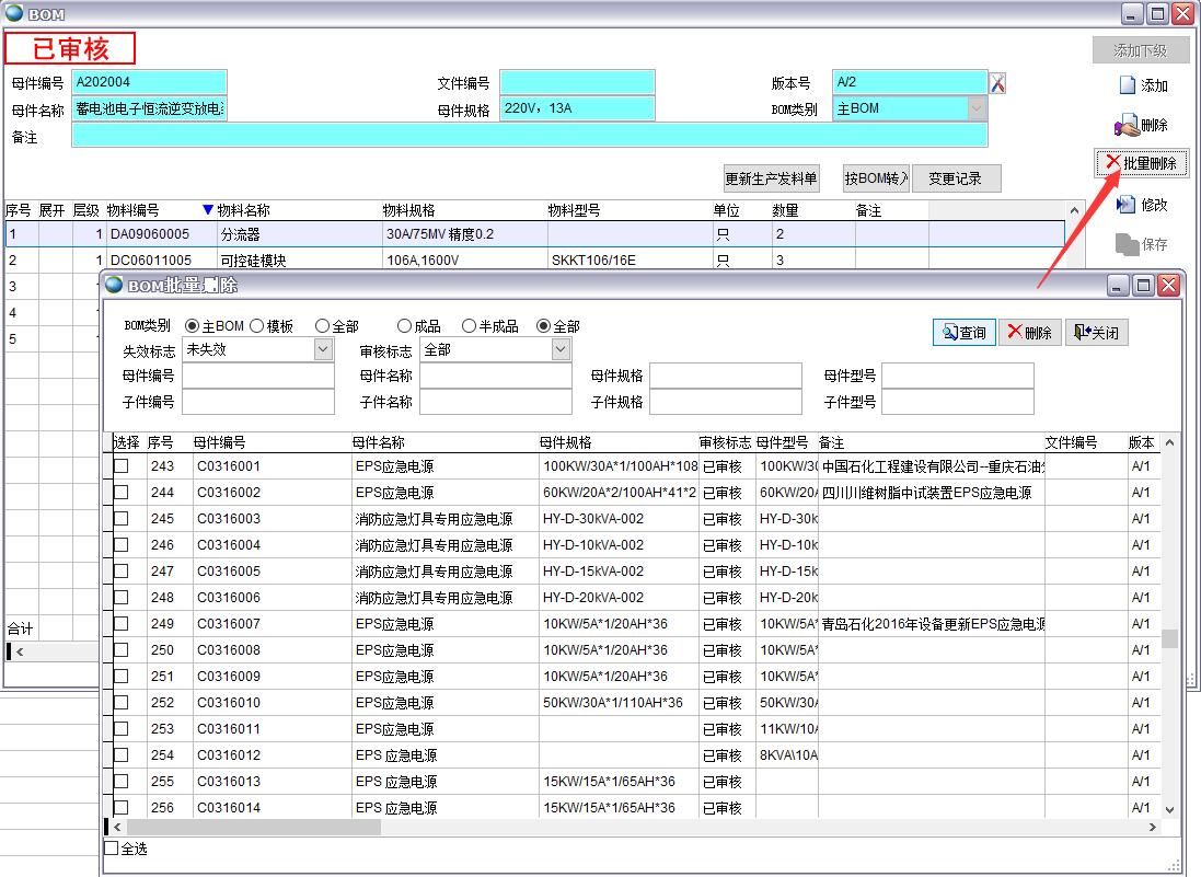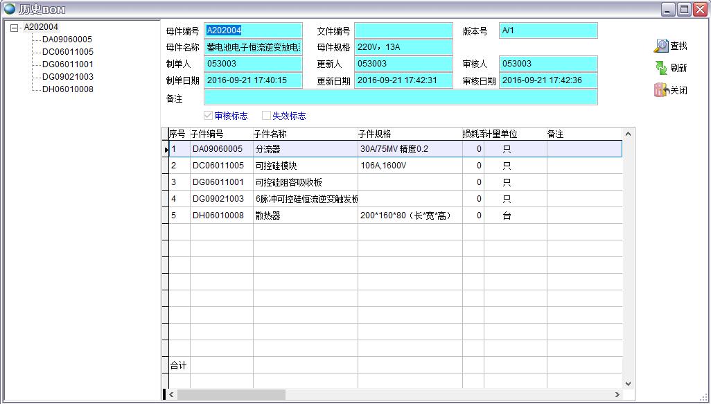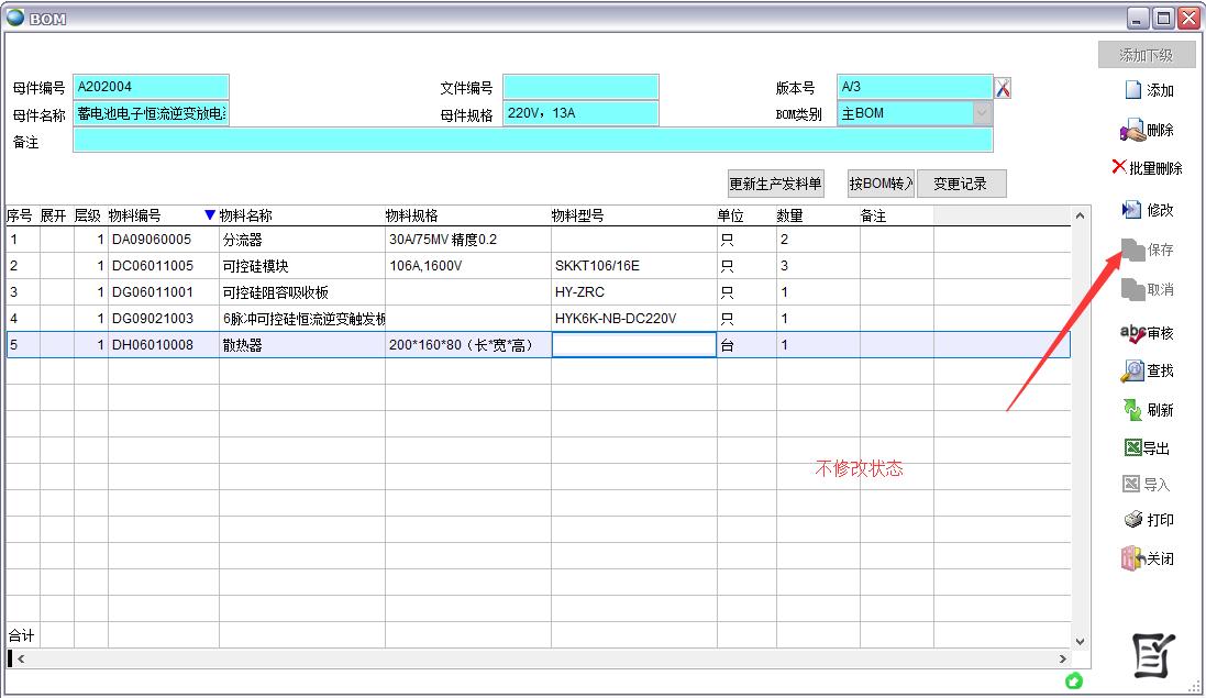 母件編號是指組成這個BOM的產成品,以上圖為例就是蓄電池電子恒流逆變放電裝置。