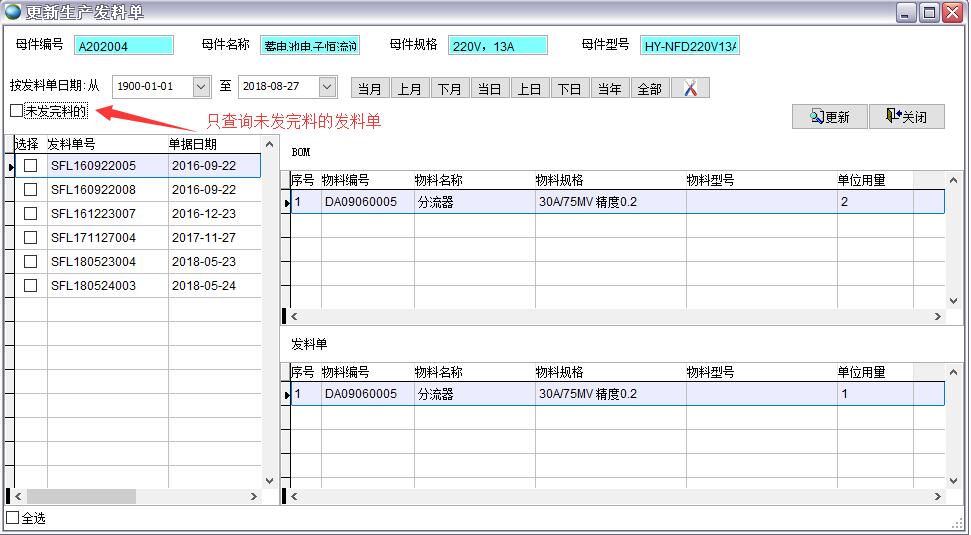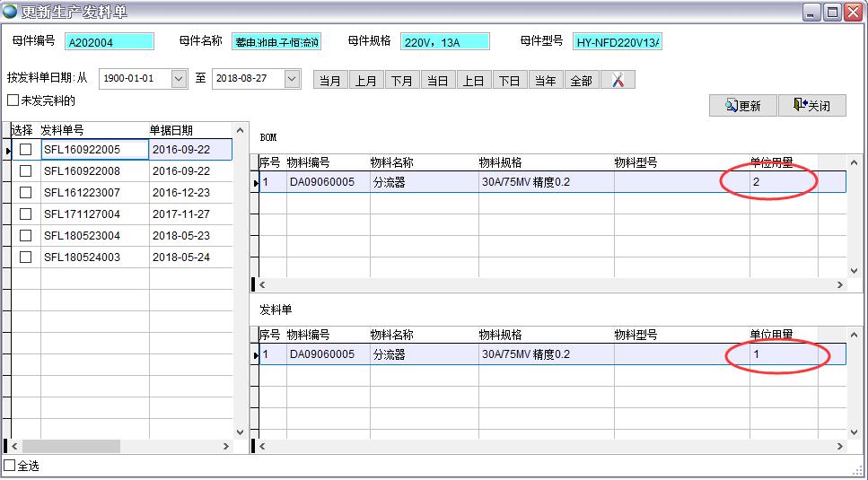 點更新生產發料單可以更新有存在該BOM的所有發料單,在更新生產發料單界面中可以看到物料數量變更的情況,對還未執行完的發料單可以進行變更。