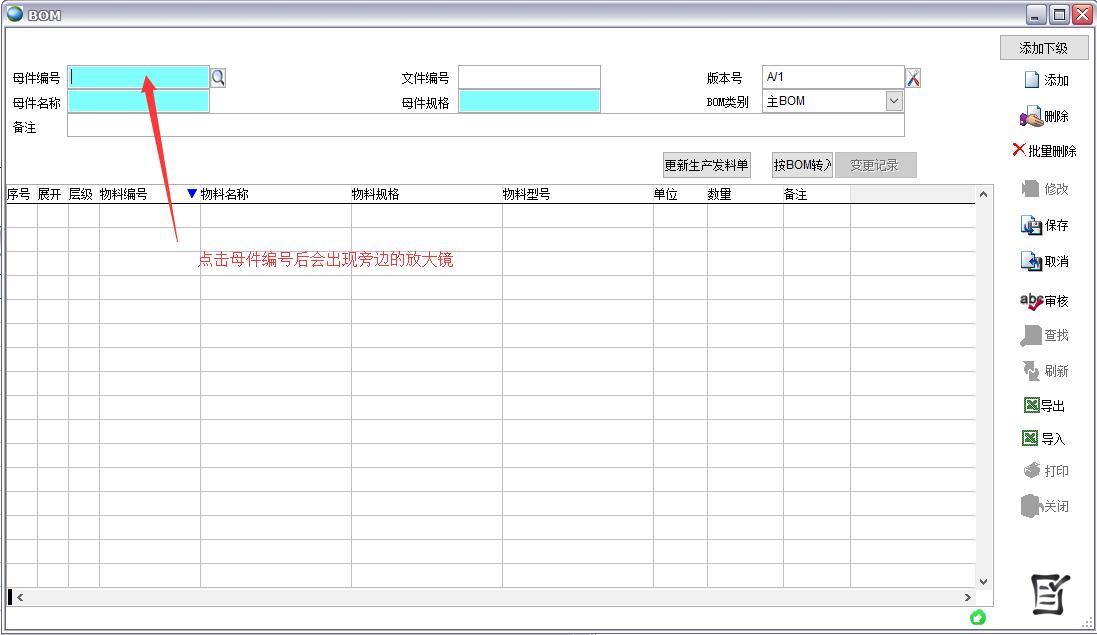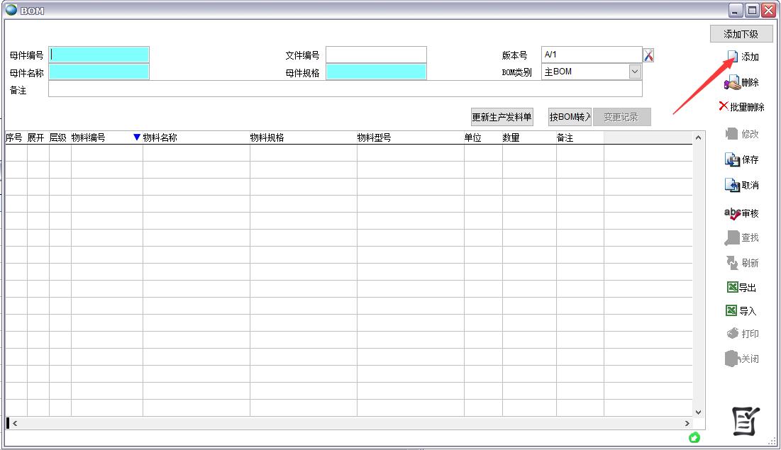 添加下級按鈕是添加選中物料的下級物料,如下圖,選中一行記錄點添加下級,此時會添加編號DH06010008的下級物料,如果該物料沒有BOM,添加完后會自動生成BOM