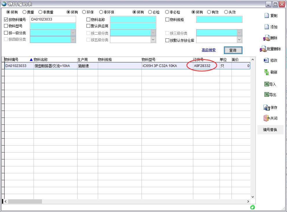 如下圖的訂貨號,引用了物料編碼表的訂貨號