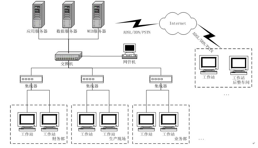 本系統考慮可擴展性及未來系統要求,在邏輯上設三臺服務器,分別是應用服務器、數據服務器、WEB服務器。三個服務器通過中心交換機與企業內部網絡(LAN)相連,中心交換機通過級聯與各個工作站連接在一起,組成本系統的硬件網絡環境。另外,內部網絡可以通過PSTN/ADSL/DDN等方式上聯接入Internet,提供外聯接口,各個其它車間可以通過Internet訪問本地服務器。