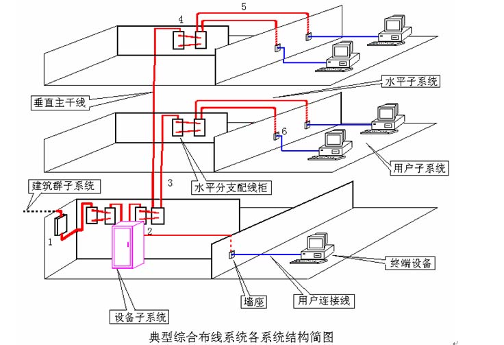 根據布線系統的建議,綜合布線系統可劃分為工作區子系統、水平子系統、管理子系統、垂直子系統和樓群子系統6大子系統構成,以下是構成圖: