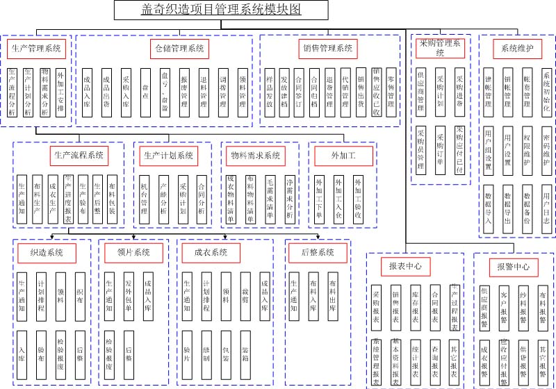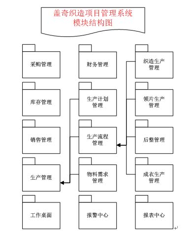 在整個系統中,**生產過程管理系統,主要包括功能模塊有:生產管理,進貨(采購)管理,庫存管理,銷售管理等四個。而生產管理下分為生產計劃管理、生產流程管理、物料需求管理三個模塊,而生產流程管理中,系統又劃分為織造生產管理、領片生產管理、后整管理、成衣生產管理。而另外三個是輔助模塊,對要是對整個系統在操作和功能的提升。在功能模塊中,模塊是以實現功能為主線。而在輔助模塊中是以實現輔助功能而設。