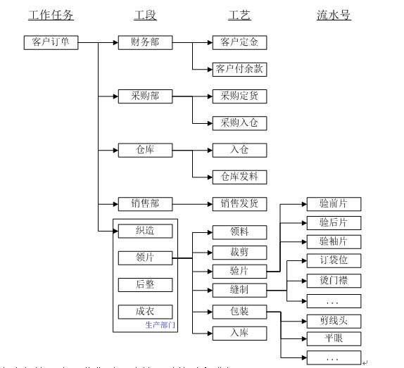 一般地,本系統粗略管理和精細管理就是為了使系統靈活操作,用戶在使用時可以根據自身的情況,或者某個時期的特殊需要,自定義上述流程的各個工序及流水號。如果用戶想對本工序進行詳細管理甚至日報表、現場生產數量,就可以采用精細管理;而如果某個工序中用戶不太感興趣或目前該工序參與力度不深,就可以采用粗略管理來控制,同時,本系統又認為:精細管理中工序級的管理者(如織造組長、成衣組長等),可以對工序級數量或報表進行控制,而現場院生產數量(如某流水號生產記錄表)現場生產員工也可以進行錄入和控制。