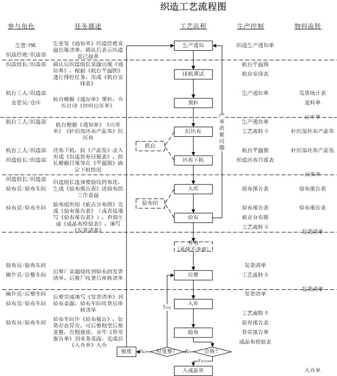 驗布:驗布組接《發貨單》后,組織工人開始驗布,由于這是成品布的最后一道工序,因此驗布過程比較嚴格。如果在驗布過程中存在異常,則填寫相應的《異常報告單》到業務部工作桌面,在對異常的處理中,如果可以重新后整,則返回到后整車間重整,如果只能報廢,則通過《異常報告單》到業務部后,業務部可根據情況,重新下生產通知單進行生產。驗布完成,入成品倉庫,完成織造過程。